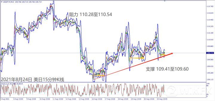日级别线图,近四天在109.60上方震荡,守住5日均线三天,有望突破60日均线;15分钟K线,短线出现盘涨,延续上升趋势线走势,有机会挑战前高阻力。