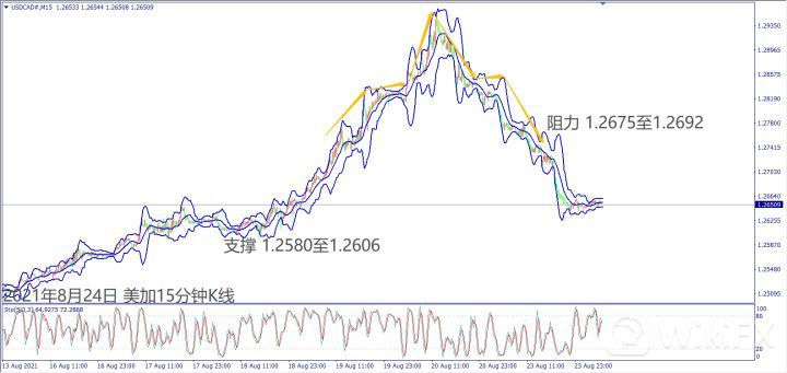 日级别线图,长阳烛形成V型反转,0.7200关口多方支撑,利好涨势冲向10日均线;15分钟K线,短线出现盘涨,守住上升趋势,大有可能挑战前高阻力。