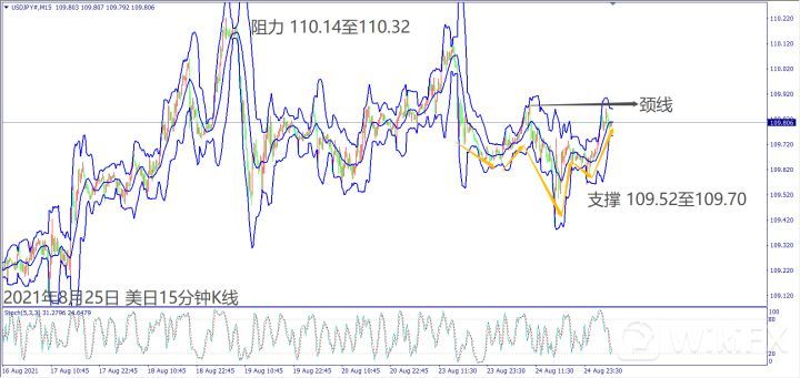 日级别线图,出现十字星反转信号,一旦跌破10日均线,大有可能回测30日均线;15分钟K线,早上回落出现圆形顶,反弹冲不过15分钟布林带中轨,可能下探起涨支撑。