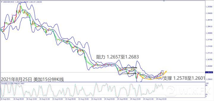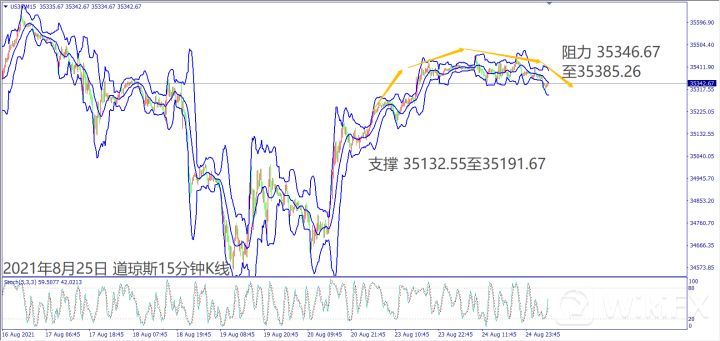 美国3.5万亿基建法案大有可能今天在参议院通过,但是道琼斯和纳指已经先行反应上涨,短线若没有买盘推升涨势,大有可能出现获利抛售。纳指若跌破小时布林带下轨线15338,建议偏空操作。道琼斯跌破小时布林带下轨线35338,建议做空。