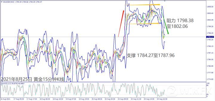 日级别线图,突破前高回落,60日均线反压盖顶,可能回测1790美元;15分钟K线,早上回落出现箱形反转,盘整底部冲不过,大有可能下探支撑。