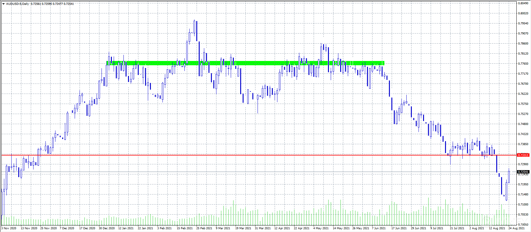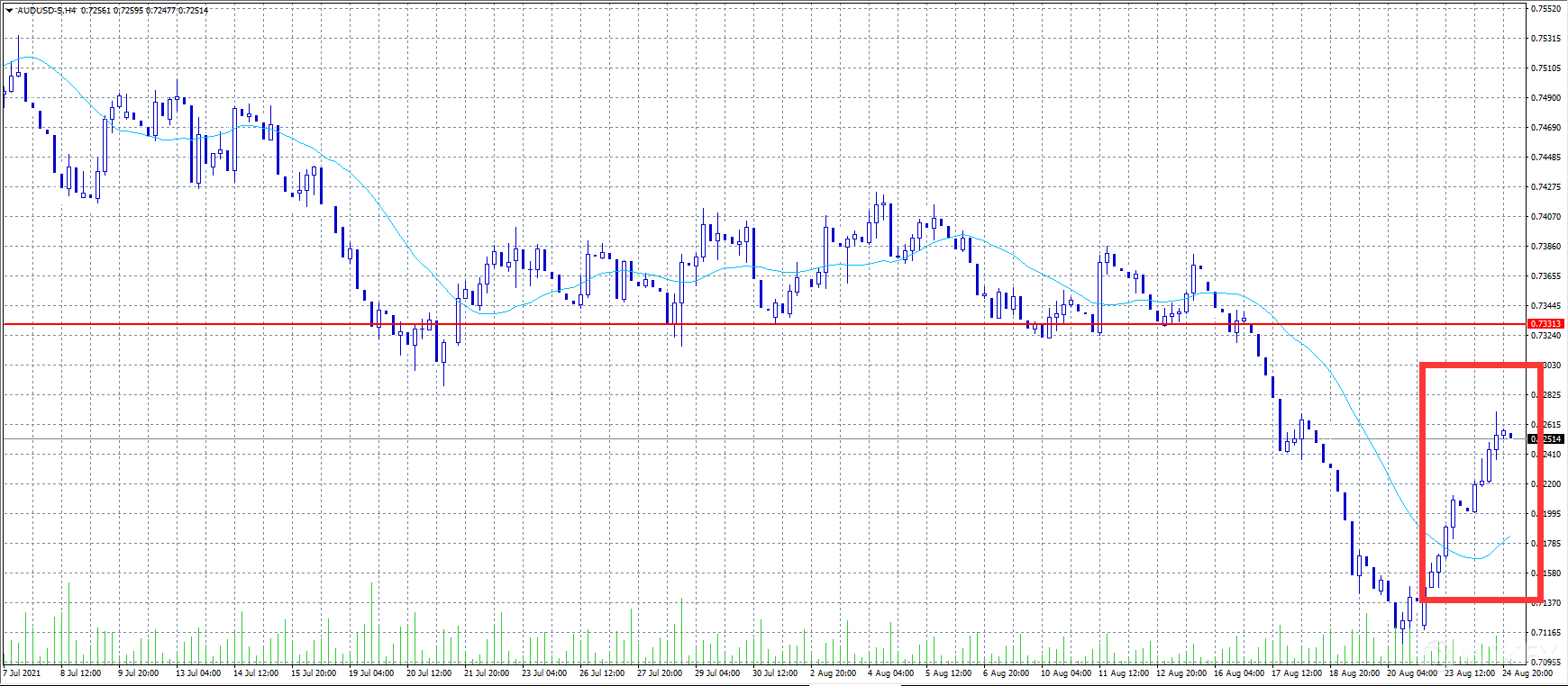 美元在昨日进一步走软,由于风险相关货币受益于大宗商品价格上涨,且市场将对Delta变种病毒扩散的担忧搁置一边,市场情绪普遍良好,且全球股市维持积极态势,澳元/美元延续周线涨幅,涨至0.7270. 市场预期美联储将被迫年底前维持超宽松货币政策,而此前预期的是,美联储最早将于本周霍尔研讨会上宣布缩减量宽政策,美元仍维持处在弱势。汇价维持看涨态势。