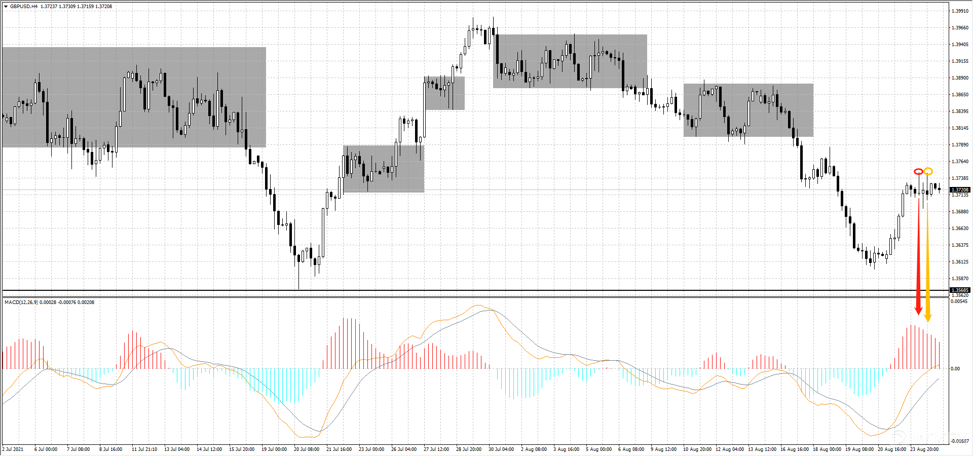 英镑日线图上看,昨日最高触及 1.37465(如图黄圈处)未能突破前一高点1.37468(如图红圈处) 且MACD双线靠近零轴,在此处受到比较大的压力,目前会有回调,短线可以考虑做空并设置止损1.3747。