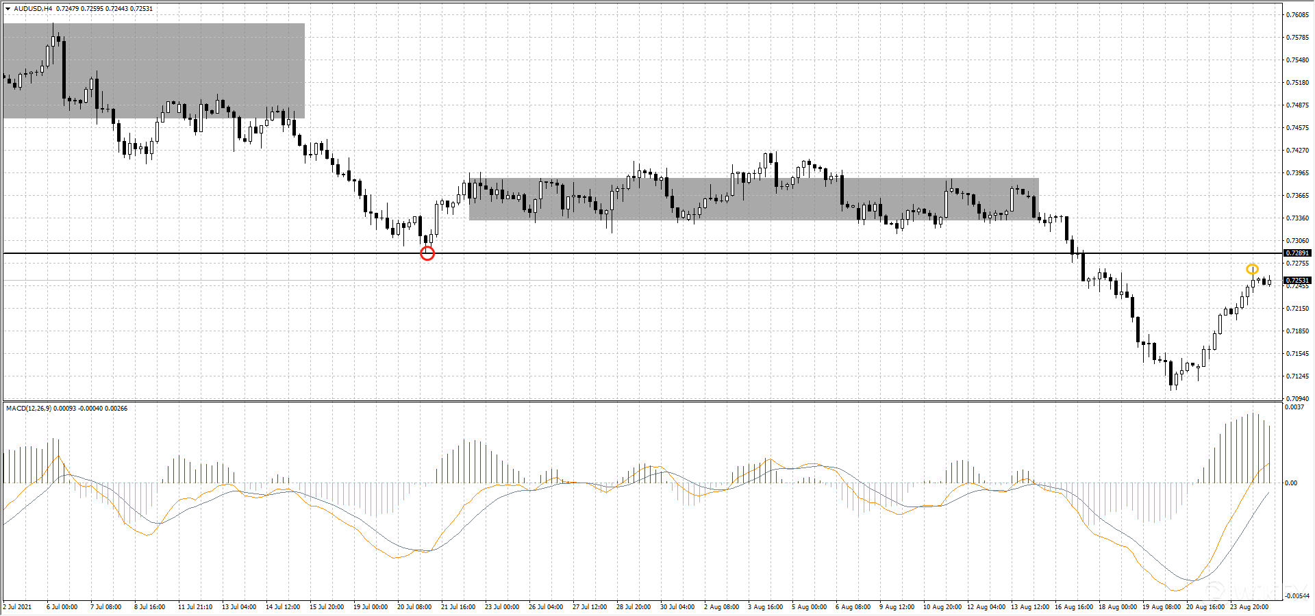 澳元4小时图上看,昨日最高触及0.7270(如图黄圈处)未能触及前一段跌势的低点0.7288(如图红圈处)在0.7288有阻力,短线可以小仓位试空并设置止损0.7288。