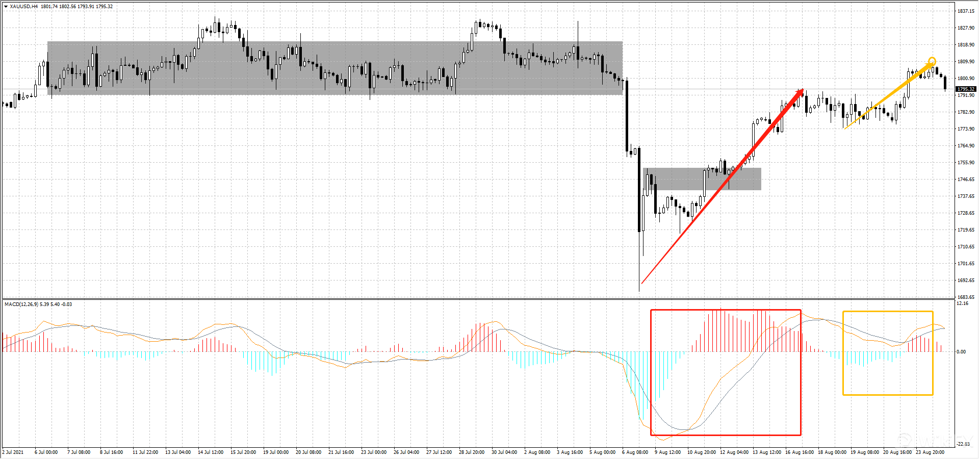 黄金4小时图上,昨日最高触及1809.48,两段上涨比较1686.60- 1795.45(如图红箭头)与1774.41-1809.48(如图黄箭头),第二段上涨力度减弱,且MACD上看价格创新高,MACD双线未创新高指标背离,MACD双线死叉即将形成,短线可以小仓位做空并设置止损1810。