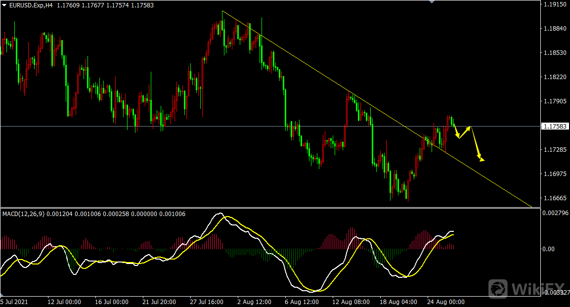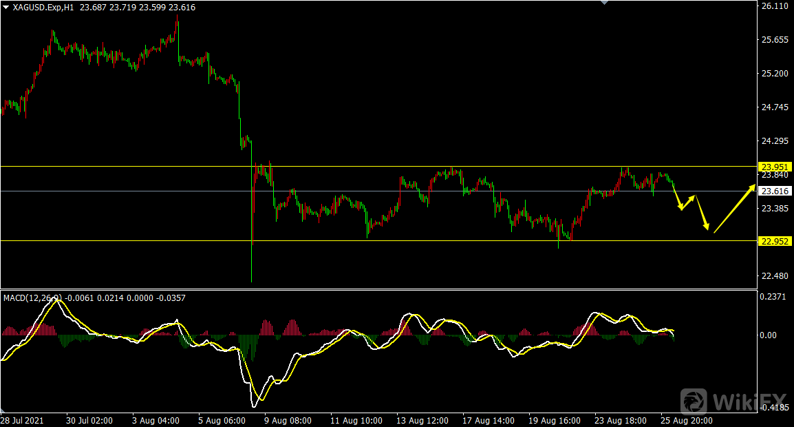 从国际白银1小时图来看,白银现在向下拐头,走势未能继续顶着压力线附近震荡,若不能突破,便还要继续震荡,时间上至少要再向后拖两个交易日。