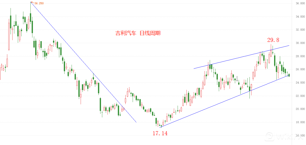 ATFX分析师团队综合观点:基本面数据低迷,难以对股价形成有力支撑。如果上涨趋势线被有效跌破,则29.8有很大可能成为中期高点,吉利汽车的跌势也将就此开启。叠加恒生指数近期表现疲软,市场情绪偏向悲观,吉利汽车股价近期难有亮眼表现。目前仅存的利多因素就是技术面上涨趋势线的支撑作用,虽然这不能改变长期走势,但短期的受支撑反弹依旧可以期待。