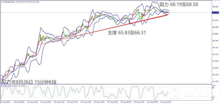 日级别线图,纺锤线受阻30日均线,67美元若跌破,可能回到空方跌势;15分钟K线,反弹涨势趋缓,一旦跌破上升趋势线,不排除下探支撑。