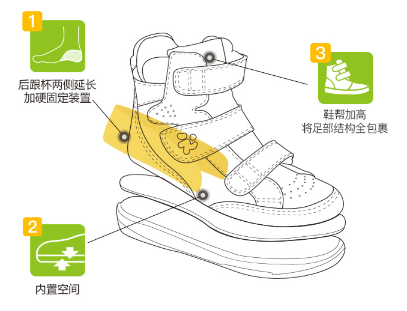 像针对有严重扁平足的孩子,会推荐穿着中帮矫正鞋。而这款矫正鞋的主要干预原理,是通过鞋内的特殊设计后跟杯、双密度鞋底、后跟锁定矫正鞋垫,来帮助严重扁平足的孩子更有效拉直生物力线,减少孩子走路时的关节劳损的几率、舒缓肌肉疲劳及严重扁平足后遗症引起的疼痛。