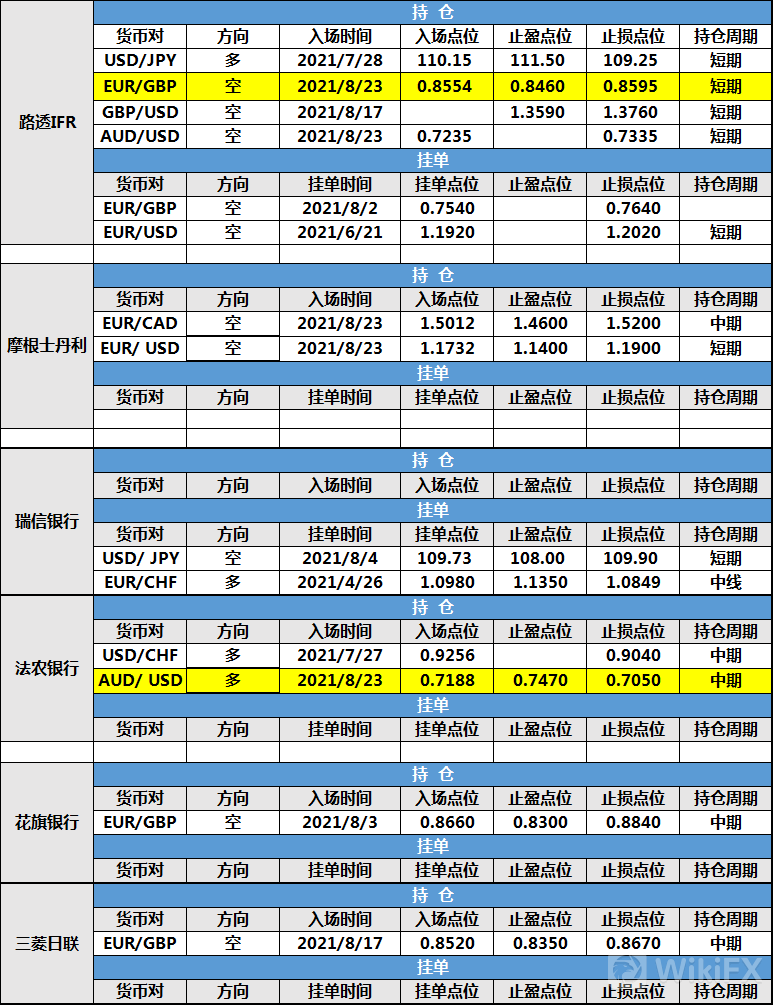 持仓分析师,路透IFR、法农银行仓位调整,路透IFR欧元兑英镑入场点位调整至0.8554,止盈点位调整至0.8460,止损点位调整至0.8595,目前处于持仓中;法农银行澳元兑美元入场点位调整至0.7188,止盈点位调整至0.7470,止损点位调整至0.7050,目前处于持仓中。