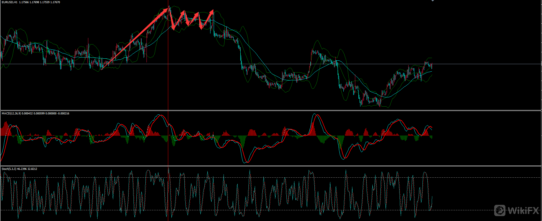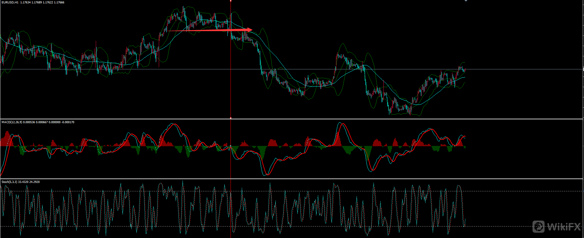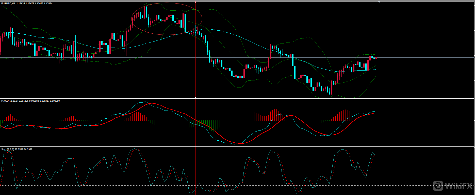 上图为欧元4H图形,一段上涨过后红圈处转入多空震荡,此区域如若不结合日线来看,当时是很难认为行情要折返,或许仅仅是一个中继调整,(这也就是大小级别互相结合的优势所在)随后布林上下轨收窄,中轨拐头向下,对应的MACD也逐步由零轴上方转为下方,4H级别做空开始。当然至于后市是否再度被支撑那是行情延续力度问题,我们要做的只是顺应行情,见空做空,没有永远的下跌,支撑后减仓或离场就是。