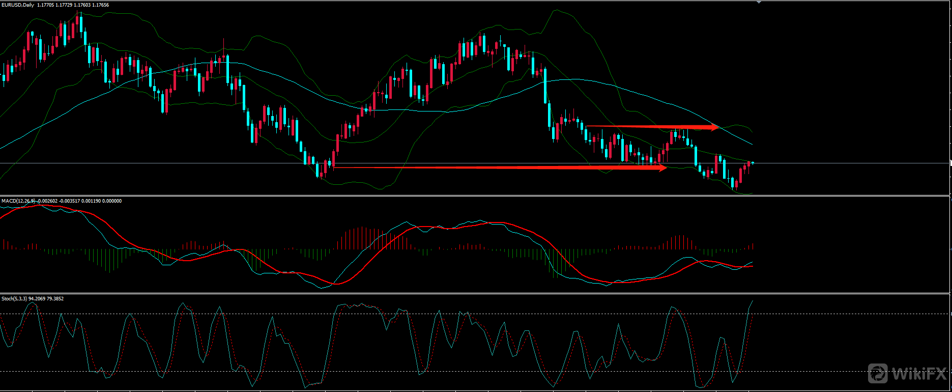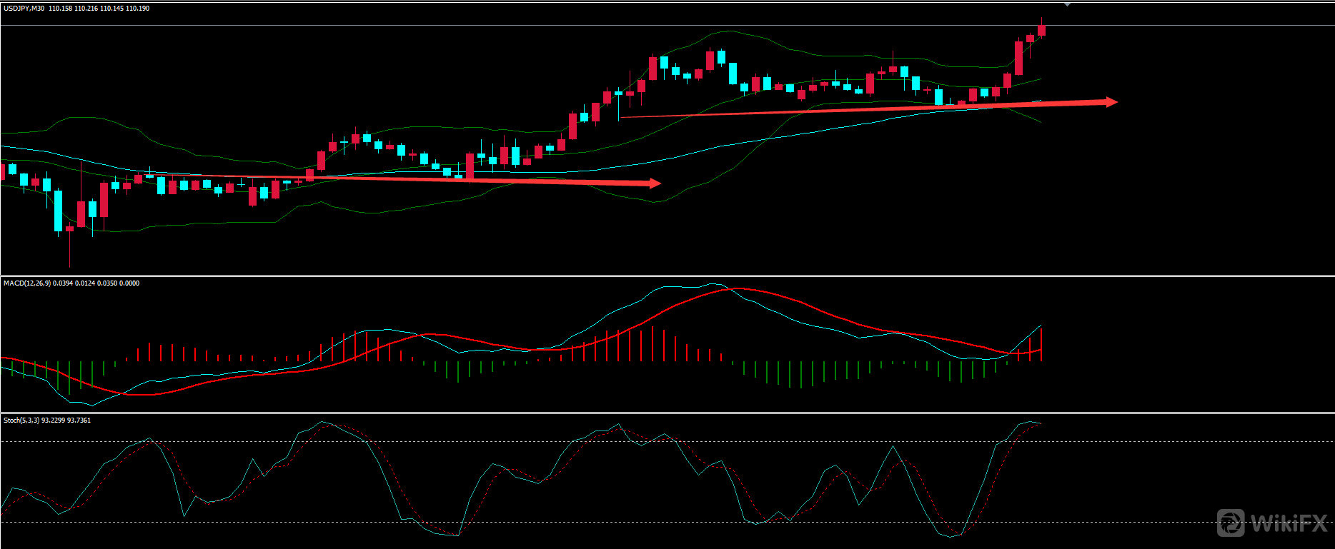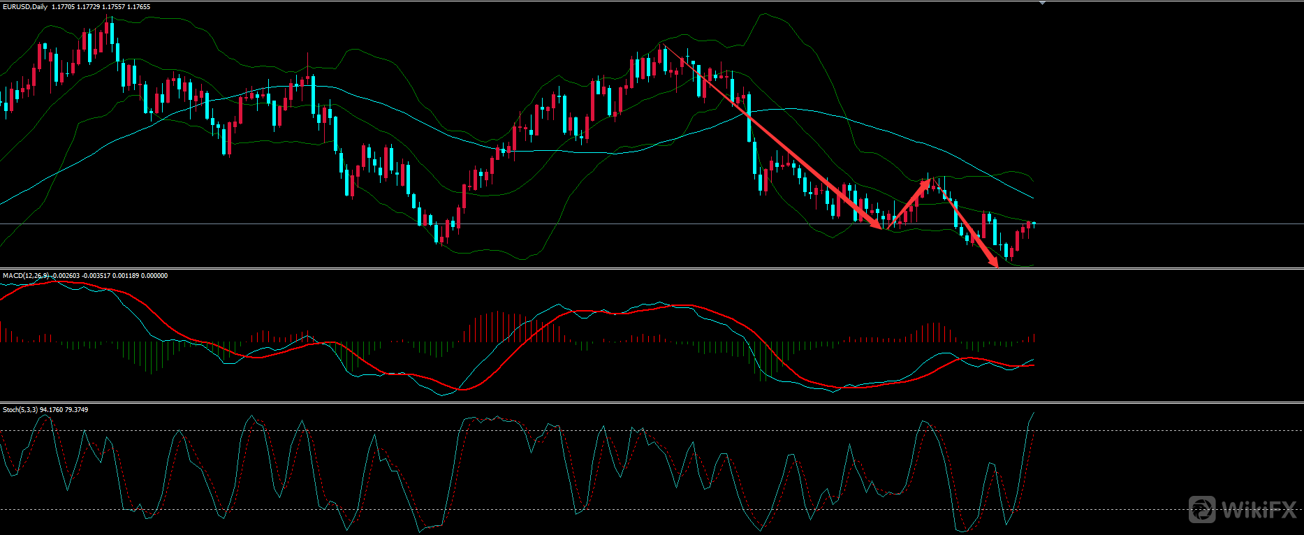 上图为欧元4H图形,一段上涨过后红圈处转入多空震荡,此区域如若不结合日线来看,当时是很难认为行情要折返,或许仅仅是一个中继调整,(这也就是大小级别互相结合的优势所在)随后布林上下轨收窄,中轨拐头向下,对应的MACD也逐步由零轴上方转为下方,4H级别做空开始。当然至于后市是否再度被支撑那是行情延续力度问题,我们要做的只是顺应行情,见空做空,没有永远的下跌,支撑后减仓或离场就是。