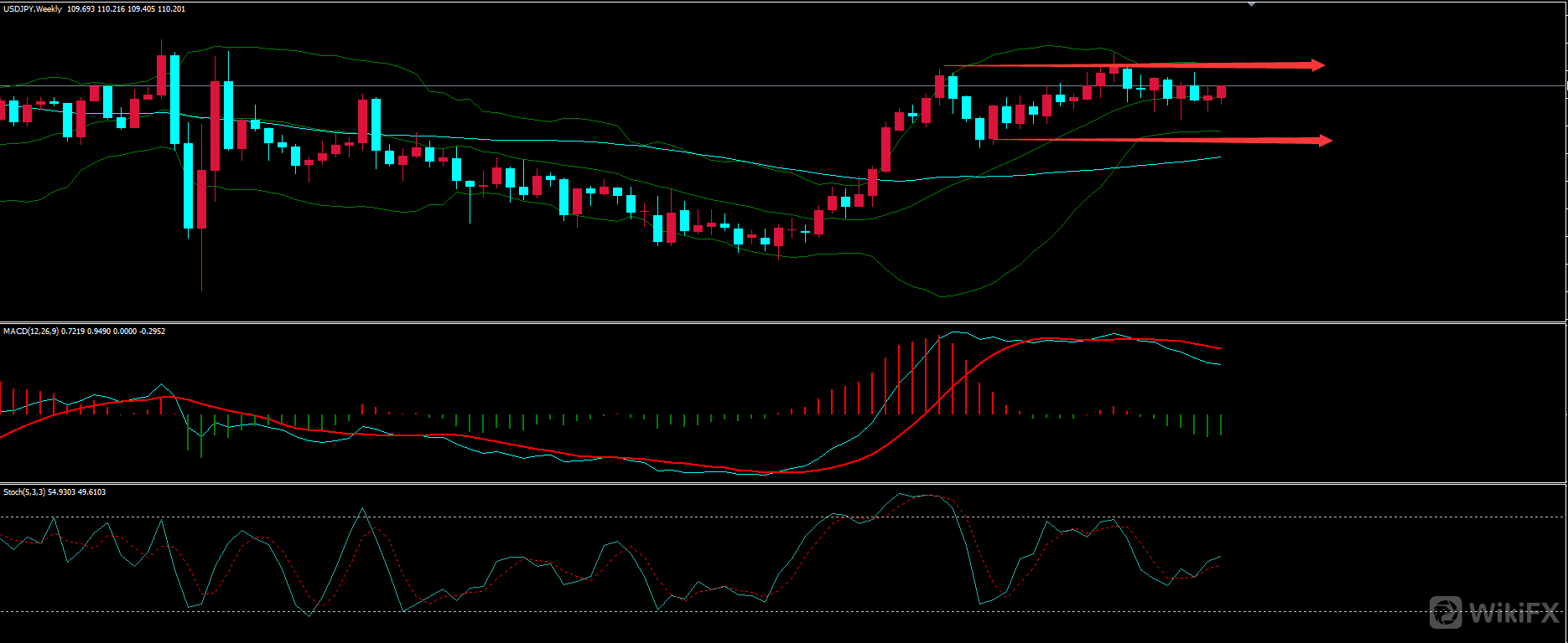 上图为美日周线图,尽管数周以来一直呈现阴阳交替局面,也一度令小周期转空,但如果从周线级别可以看到,本级别仅仅是高位震荡,下方支撑坚守,所以不论小周期怎样曲折大的方向还是没有从根本上改变的,因此一旦获得支撑,小级别便会出现做多机会。
