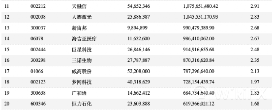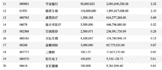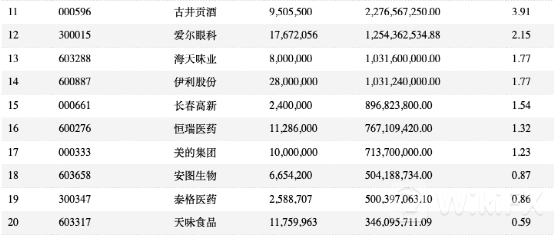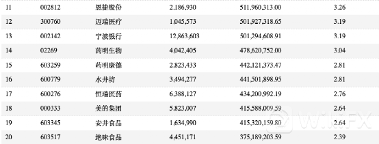从隐形重仓股来看,位列第11-14大重仓股的恩捷股份、迈瑞医疗、宁波银行、药明生物的基金持股市值占基金净值比例在3%以上,位列15-20大重仓股的药明康德、水井坊、恒瑞医疗、美的集团、安井食品、绝味食品,占基金净值比超过2%。