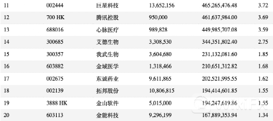 除了此前已披露的十大重仓股之外,第11-14大重仓股分别为巨星科技、腾讯控股、心脉医疗、艾德生物,持股市值占基金净值比例在2%以上。我武生物、金域医学、东诚药业、拓邦股份、金山软件、金能科技持股市值占基金净值比例在1%以上,分列第15-20大重仓股。