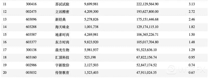 从隐形重仓股来看,位居第11-13位大重仓股的苏试试验、立讯精密、新经典的基金持股市值占基金净值比在2%以上;位居第14-20大重仓股的海天味业、地素时尚、东方时尚、晨光生物、汇顶科技、宇新股份、传智教育。其中,传智教育首次出现在该基金的持股名单中。