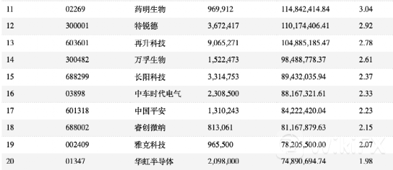 截至二季度末,第11至20大重仓股分别为药明生物、特锐德、再升科技、万孚生物、长阳科技、中车时代电气、中国平安、睿创微纳、雅克科技、华虹半导体,除了华虹半导体外,其余股票市值占基金净值比均在2%以上。