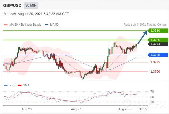 交易策略:在1.3745之上,看涨,目标价位为1.3785,然后为1.3810。