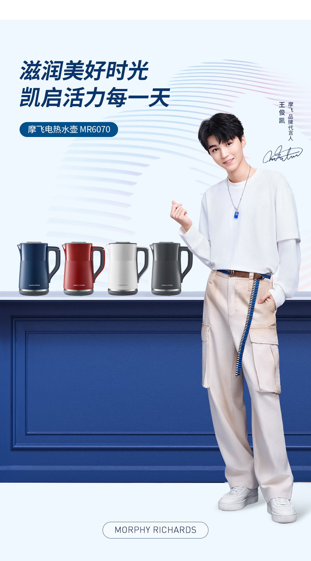 据悉,由青年歌手、演员王俊凯代言的家电大牌摩飞为满足人们对品质生活的更高追求,推出一款新品——摩飞电热水壶MR6070,凭借时尚高颜值外观、便捷高效的功能设计以及人性化的安全保障,为年轻人带来精致感十足的饮水体验,助力提升生活质感。