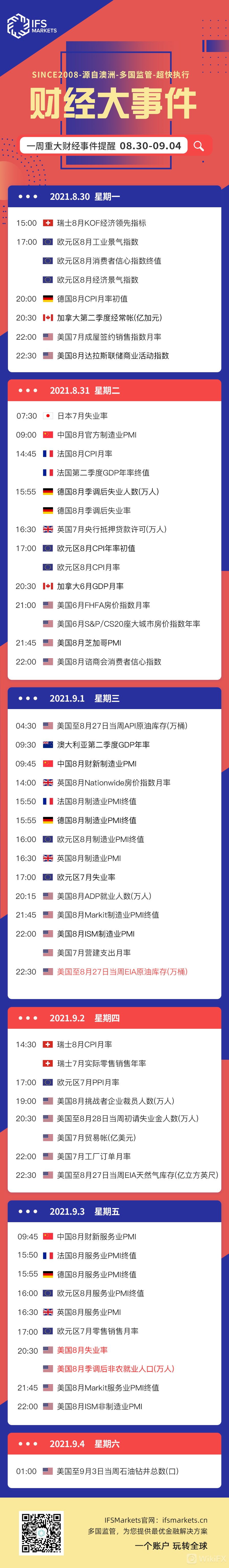 财经数据方面,欧元区8月消费者信心指数数据,中国8月官方制造业PMI数据,美国8月ADP就业人数数据,美国7月贸易帐数据,美国8月非农就业报告值得关注。富途控股、美团、网易、中国恒大、赣锋锂业、Zoom、理想汽车、呷哺呷哺将陆续公布财报。