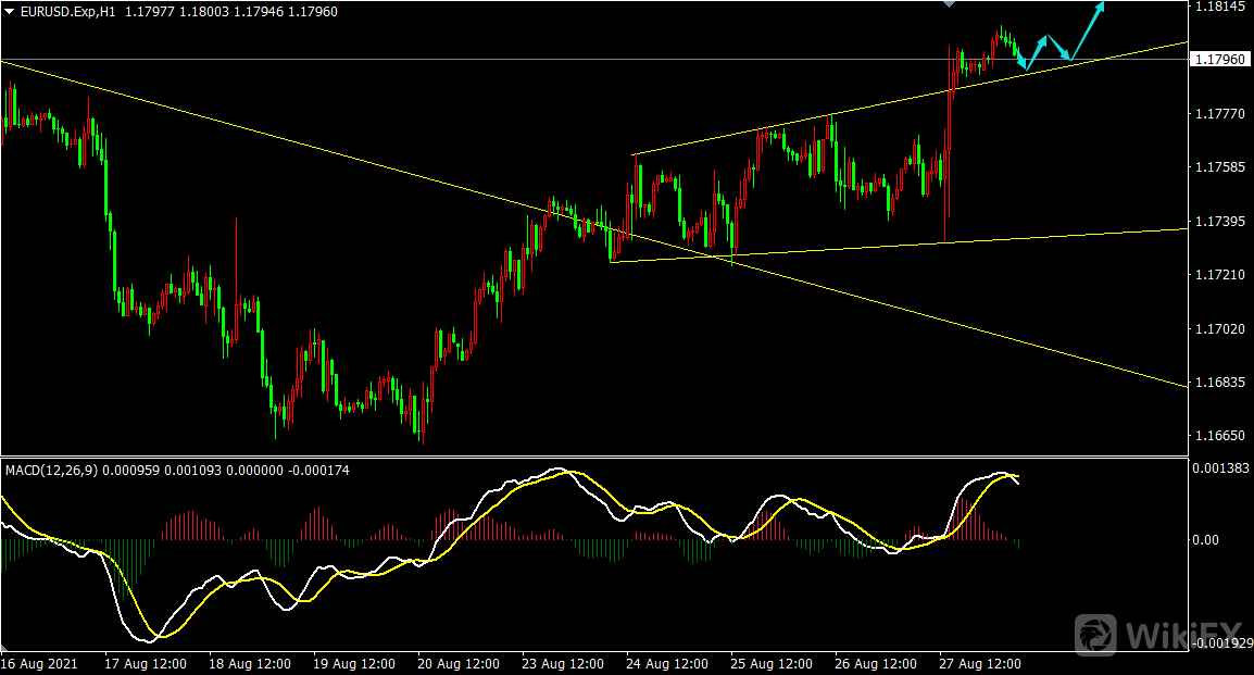 从欧元兑美元1小时图来看,欧元兑美元上周五直接阳线上穿,前期的拉升本是等待回踩确认是否真突破,目前看回踩则演化为横盘,欧美极大概率已完成转势。