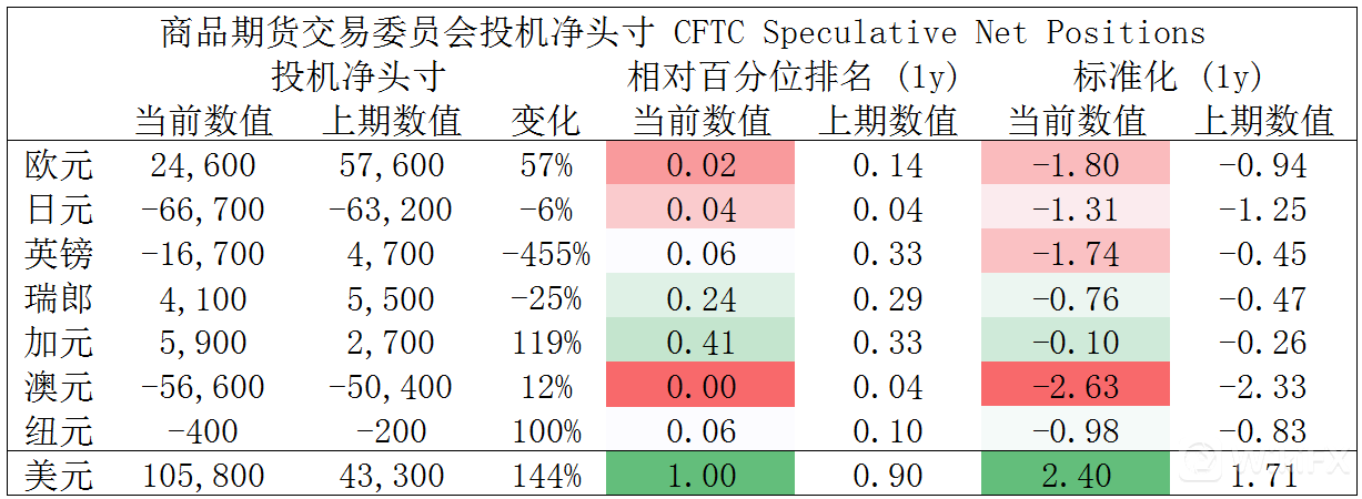 CFTC资金流数据显示,澳元、欧元空头处于极值,因此,预计短期随着资金流入并支持其回涨,另外,美元多头也处于极值。