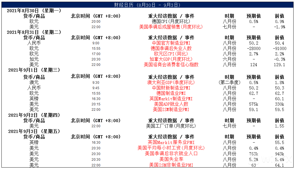 美元方面,周一,美元在触及两周低位后企稳。就目前来看,市场仍在消化鲍威尔的鸽派缩减刺激讲话,而接下来美元的走势将取决于数据,通胀和就业数据,当前市场预计美国8月非农就业岗位将增加75万个,失业率料从5.4%降至5.2%,相对来看还是比较强。因此,预计美元中长线仍为偏强结构,短线整理或许并且未完全结束。
