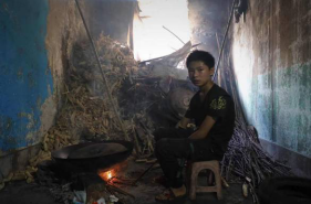 在这样一个所谓的“家”里,没有一件像样的家具与家电;房间外的走道即是“厨房”——一个堆满了干玉米棒子和干树枝的地方。镜头下,14岁的孩子熟练的在地上三个砖头围成的“灶”上点燃干枝生火做饭,腾起的炊烟在楼道里弥漫着呛人的味道,一旁地上摆放的锅里,留着小半锅面条……的拉古说,那是他的晚餐。