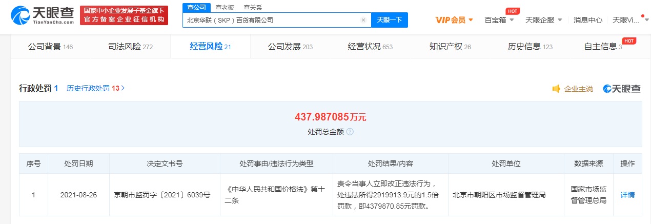 据天眼查App数据,近日,SKP关联公司北京华联(SKP)百货有限公司因违反价格法相关条款被罚4379870.85元,责令立即改正违法行为。处罚机关为北京市朝阳区市场监督管理局。