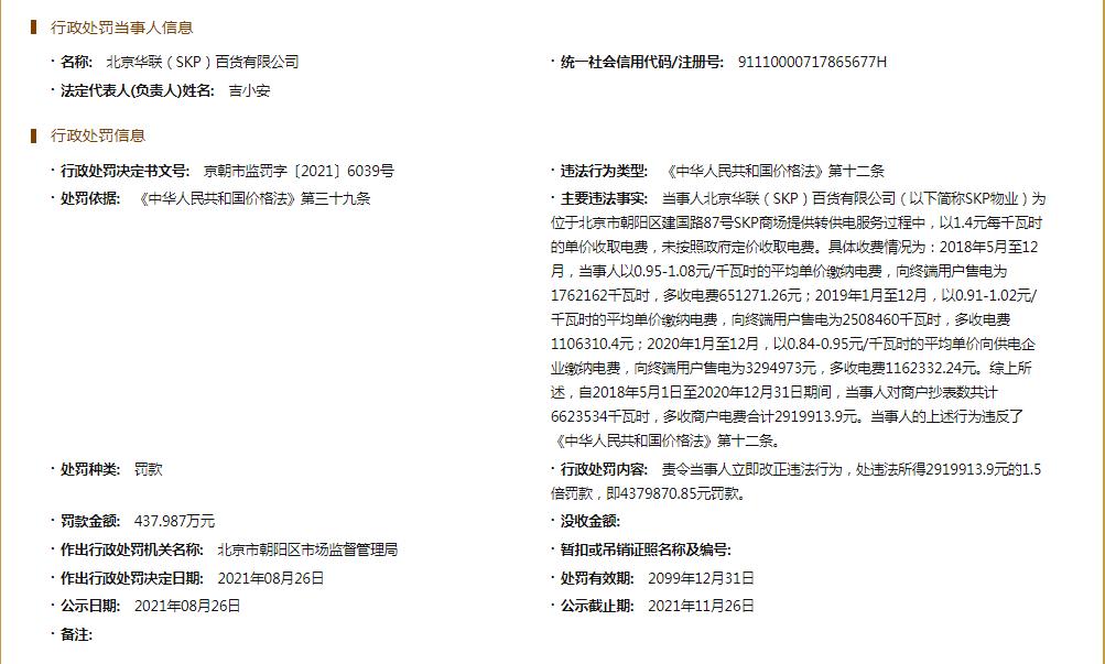 另据信用中国网站消息,SKP关联公司具体违法情形是未按照官方定价收取电费,多收商户电费合计2919913.9元。