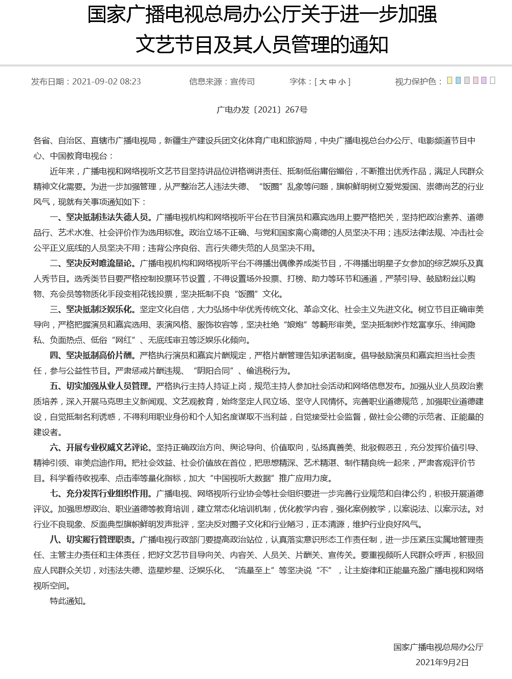 通知提到,近年来,广播电视和网络视听文艺节目坚持讲品位讲格调讲责任、抵制低俗庸俗媚俗,不断推出优秀作品,满足人民群众精神文化需要。为进一步加强管理,从严整治艺人违法失德、“饭圈”乱象等问题,旗帜鲜明树立爱党爱国、崇德尚艺的行业风气,现就有关事项通知如下: