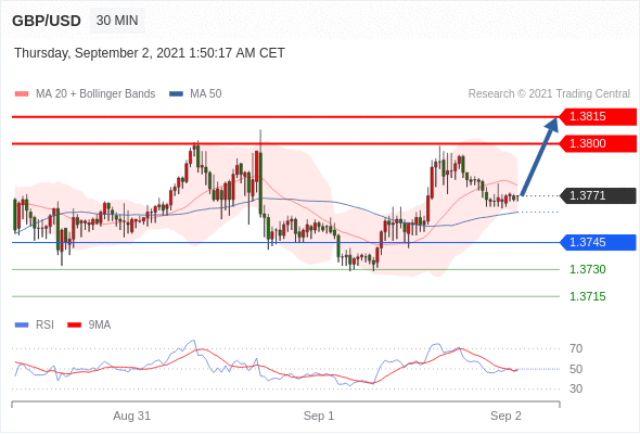 交易策略:在1.3745之上,看涨,目标价位为1.3800,然后为1.3815。