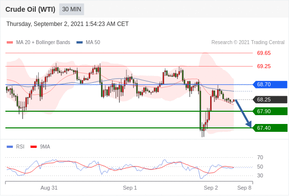 交易策略:在68.70之下,看跌,目标价位为67.90,然后为67.40。