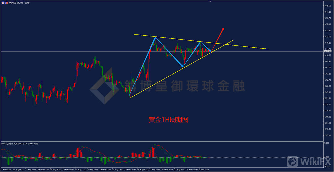 从下图的黄金1H周期图来看,黄金于此前向上突破1810一线后,当前成功企稳于上方进行横盘整理。从形态上来看,当前黄金呈现三角收敛形态,预计行情即将选择方向。从MACD指标来看,当前多空动能柱均呈现缩量状态,目前DIFF与DEA双线于0轴附近进行缠绕,预计当前行情大概率将逐渐缩小震荡空间后进行突破。建议日内以突破做多为主,可等待行情上破或下破关键点位后入场。
