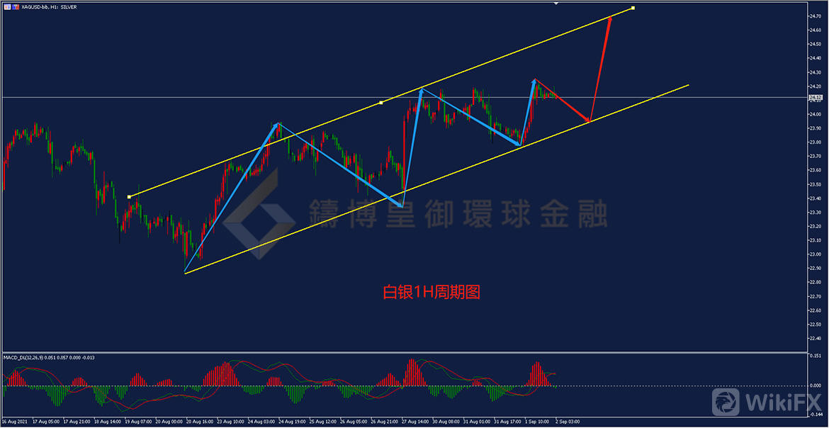 从白银1H级别来看,白银自此前从22.87一线进行上涨,当前构建高低点逐渐上移的上涨结构,行情于结构内进行震荡上行。从指标上来看,目前MACD指标多头动能呈现放量形态,且DIFF与DEA双线上破0轴,预计行情后市大概率将延续此前上涨趋势。但短线来看,目前DIFF与DEA双线于0轴上方即将形成死叉,白银或将迎来短线回调。建议日内可等待行情回调至结构底部附近后入场多单。