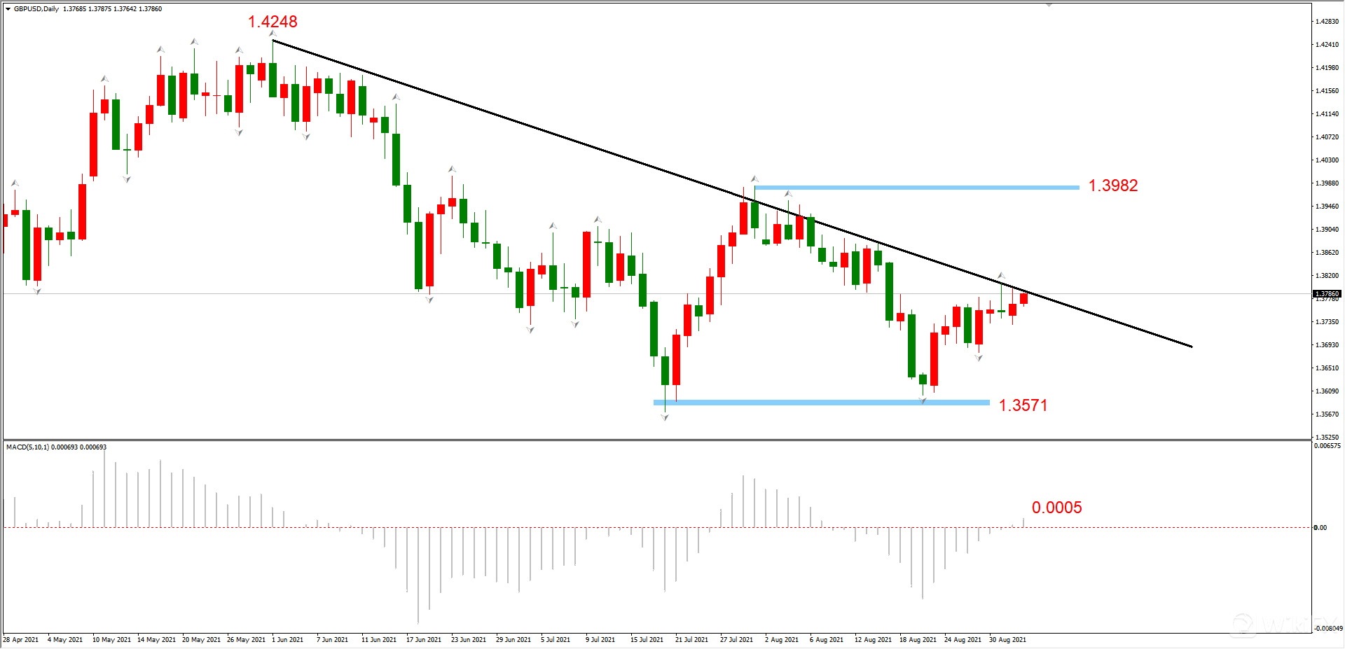市价已经反弹至下降趋势线附近,以目前的市场情绪来看,上破概率较高。不过,即便下降趋势线被突破,趋势也不会反转,关键阻力位在趋势线上方的1.3982,只有该价位被触及,才能确诊趋势由空转多。