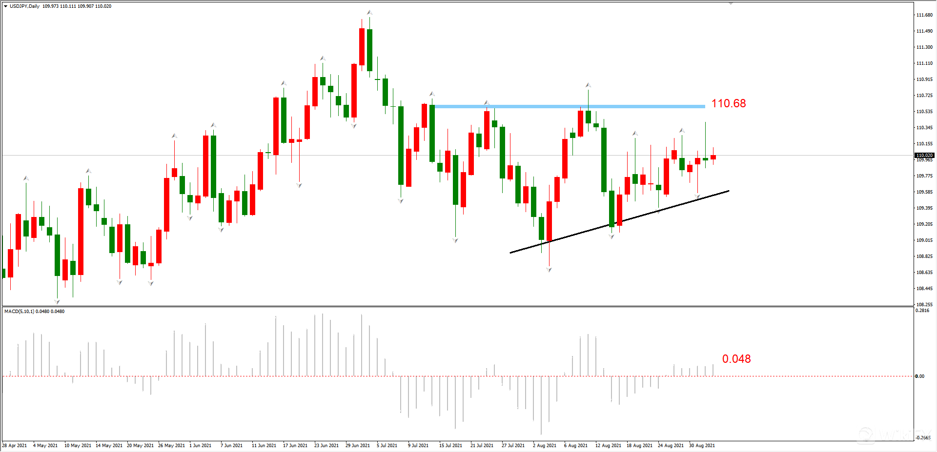 上有阻力110.68,下有支撑线,市价只能在较窄区间内震荡。连续12个交易日K线都呈现出较大的上下影响,代表多空力量较为均衡,110.00是相对稳定的报价。预计未来将会延续震荡。