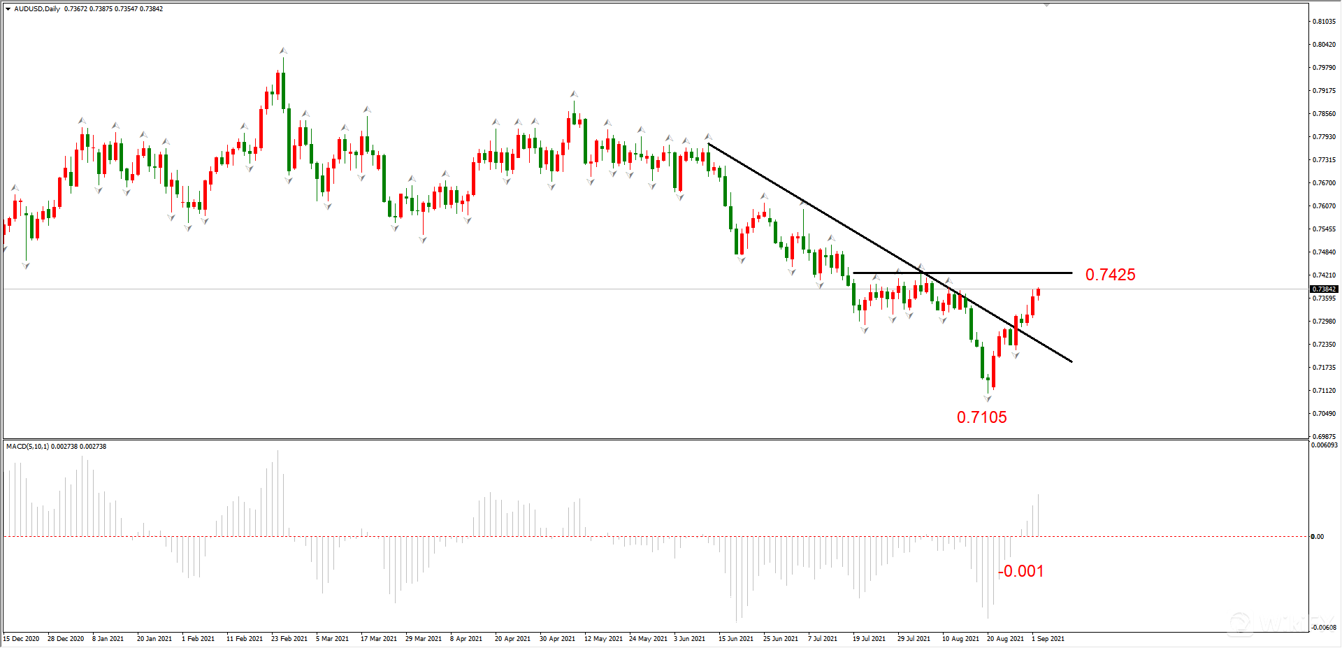 反弹波段已经有效突破下降趋势线,后市看多。上方阻力位0.7425,触及该价位后遇阻回落的概率较高。