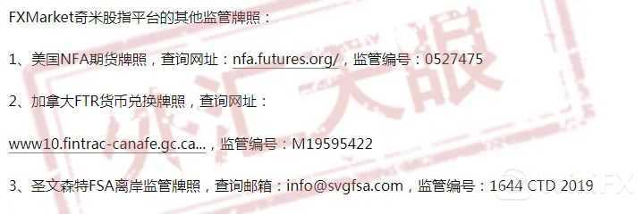 除此之外,FAMraket奇米股指还在官网宣称持有加拿大MSB监管和圣文森特和格林纳丁斯监管,但是老生常谈以上两种监管是不存在外汇方面监管的资质的。从以往的各种黑平台的案例来看,诈骗团伙经常用这两种监管牌照来哄骗不知情的新手投资者。