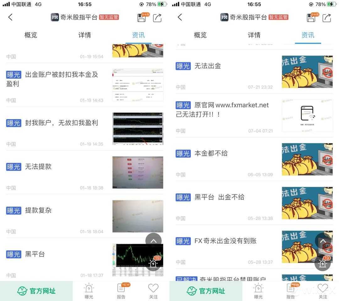 一、没有实际有效的监管牌照,总是拿没有外汇监管资质的牌照糊弄投资者;二、突如其来的更换官方网址,要知道官网跟公司、监管息息相关,仅凭虚无缥缈的理由进行更换一定要提高警惕,必要时直接出金以防万一;三、出金速度变得迟缓,且平台给出的理由不充分,建议立即远离;四、针对该平台的“流言蜚语”增多,在跑路之前奇米的客诉就一直在增加!