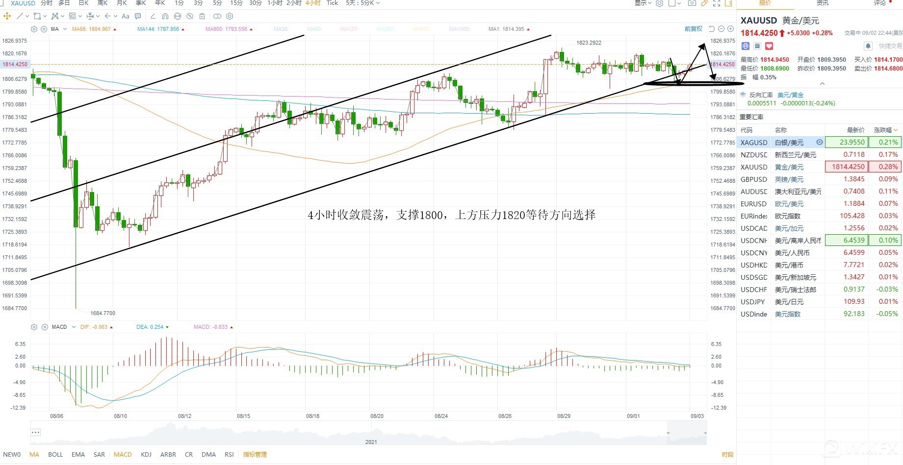 黄金短期没有方向,从技术层面上来看,4小时级别维持在趋势线上方运行,而价格进入收敛区间之后大概率需要等待非农数据给出方向,在此之前,按照震荡对待,日内重要支撑1800上方压力1820,突破1820则打开向上空间,跌破1800则继续回踩1780