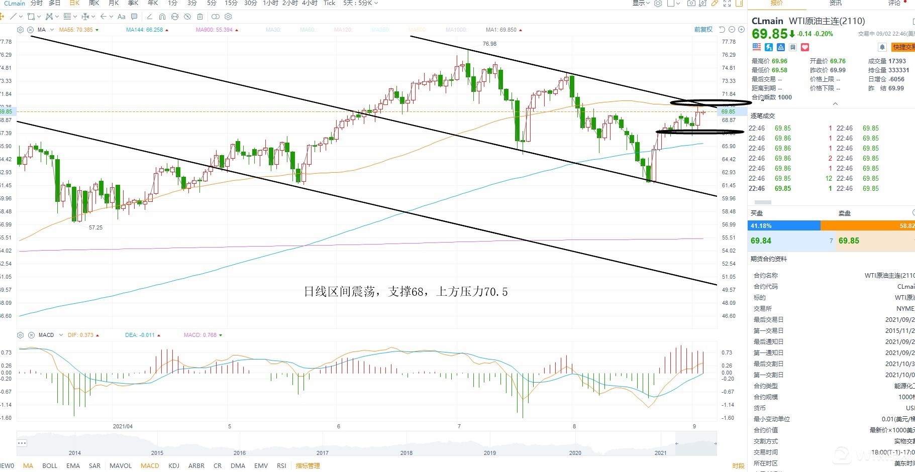 美原油连续反弹,短期乐观情绪推动下出现了持续的做多力量,但是在整数关附近,且下降趋势线压力之下,若无法突破则不排除冲高回落的可能性,短期谨防回踩,日内而言趋势线压力70.5附近成为多空分水岭,无法站上则回落是大概率时间,下方支撑68,继续关注供需层面的变化,等待方向选择