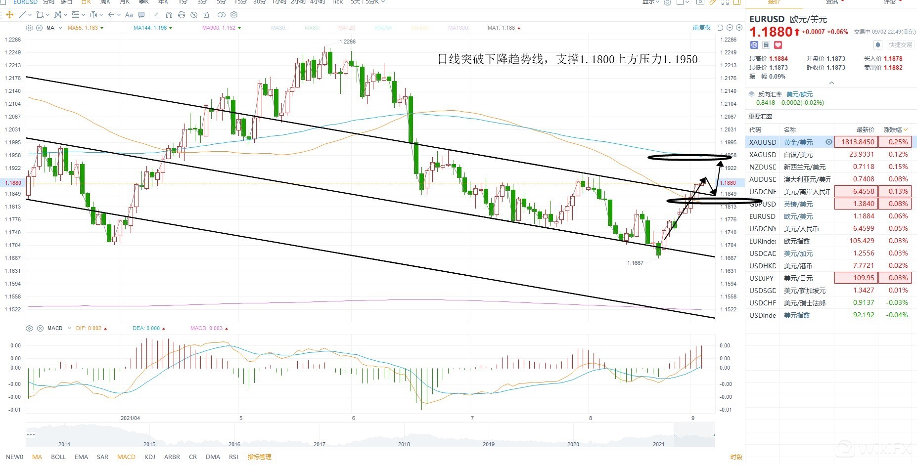 美元指数持续下行,短期非美大幅反弹,但是要注意,在非农前走强未必能够形成趋势反转,谨防冲高回落,技术层面上已经突破下降趋势线,因此上方均线压力1.1960附近等待压力测试,若回踩不破1.1800则突破有效,等待上涨,若跌破则突破失败,继续回落