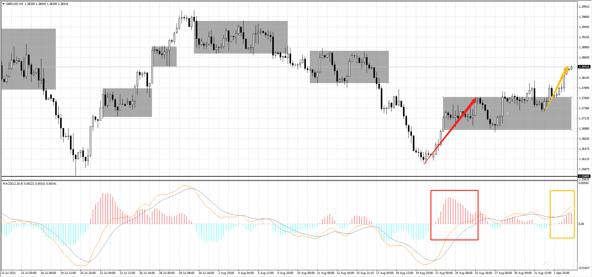 英镑4小时图上看, 昨日突破 1.3766-1.3679箱型整理区间上沿,最高触及1.3838,涨势没有明显结束的迹象,进入箱型整理区间以及离开的两段上涨比较(如图红箭头跟黄箭头处),后一段上涨的MACD红柱体积比起前一上涨体积减小,上涨力度减弱,会有技术性的回调。