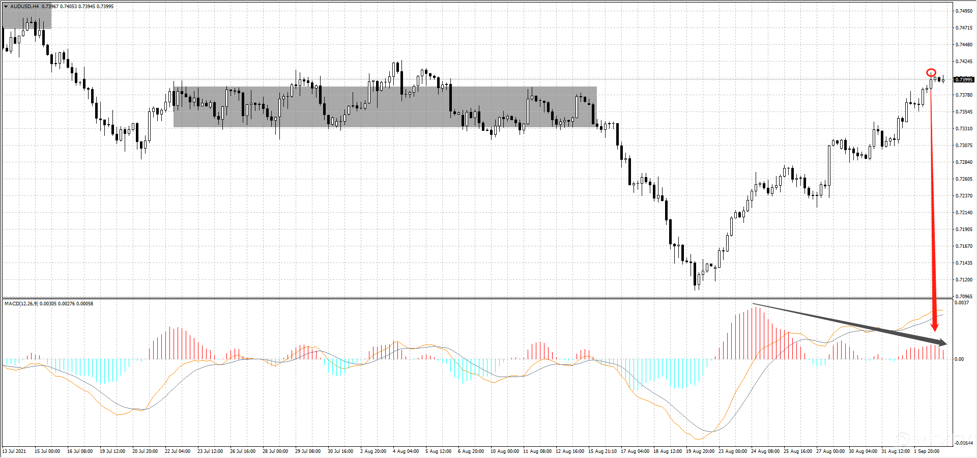 澳元4小时图上看,昨日最高触及0.7408(如图红圈处)MACD上看价格不断创新高红柱柱长缩短,上涨力度减弱,会有技术性的回调。
