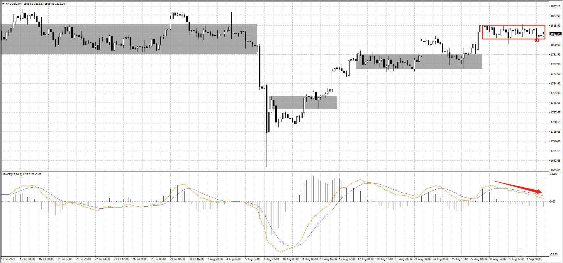 黄金4小时图上,昨日最高触及1804.89(如图红圈处)仍然处于1819.09-1807.69(如图红框处) 震荡,MACD双线靠近零轴附近,在1807.69附近小仓位做多并设置止损1800。