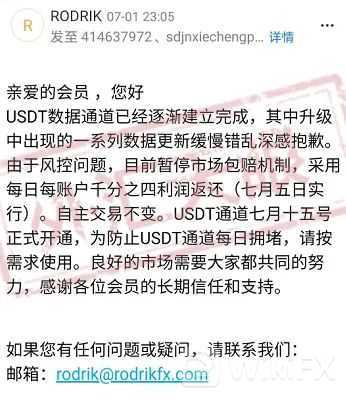 过了一个月,Rodrik又称USDT通道已经逐渐完成,但是暂停了市场包赔机制,但是王女士更加关心自己的出金到底能不能处理?明明公告说系统维护已经完成,为什么还是不能出金呢?