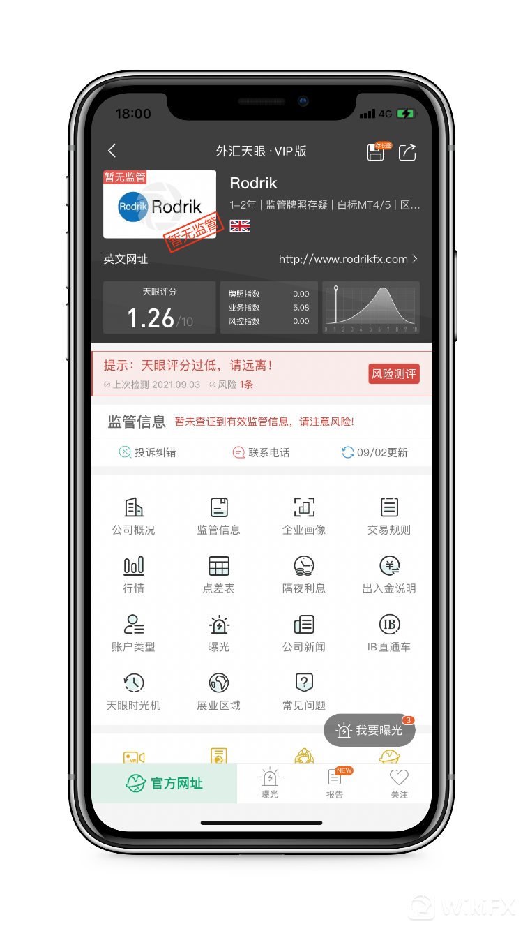 在外汇天眼上查询,Rodrik天眼评分1.26分,当前暂未查证到任何实际有效的监管牌照,存在巨大的风险,建议投资者远离。