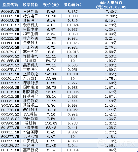 9月2日大单净额超亿元的光伏概念股: