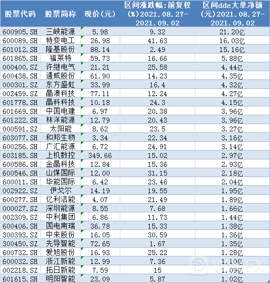 在9月2日有超过127亿主力资金涌入光伏概念,有32只个股获得超亿元的大单净额,合计吸金高达95亿元。其中,主力资金追捧的是三峡能源和特变电工,大单净流入超10亿元,分别获得了17.69亿元、12.90亿元的大单净额。